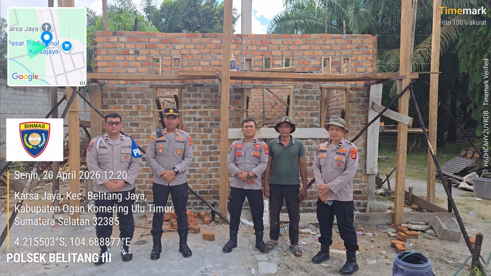 KITAMEDIA,BELITANG III OKU TIMUR– Kapolsek Belitang III, IPTU Sapariyanto, SH., didampingi oleh jajaran pejabat dan personil Polsek setempat, melakukan monitoring perkembangan pelaksanaan program Bedah Rumah bantuan Kapolda Sumatera Selatan, Senin (20/04/2026) sekira pukul 12.15 WIB.