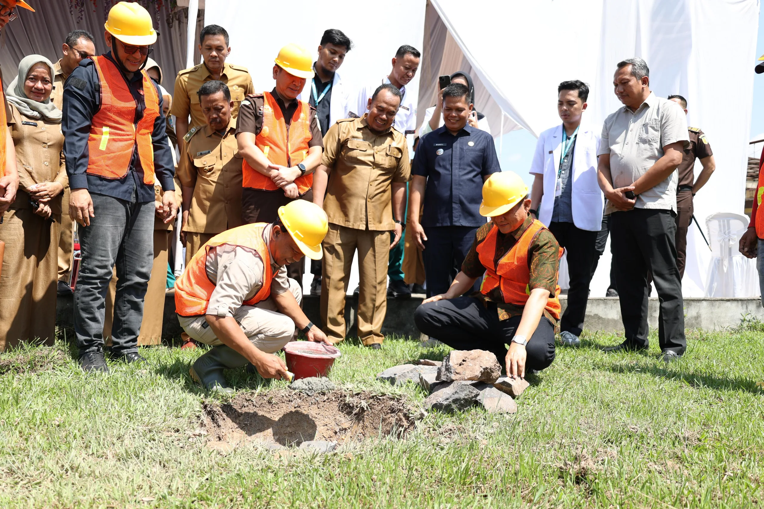 OKU TIMUR – Bupati OKU Timur Ir. H. Lanosin, M.T., M.M. didampingi Wakil Bupati OKU Timur H.M. Adi Nugraha Purna Yudha, S.H., melaksanakan peletakan batu pertama pembangunan Gedung Instalasi Gawat Darurat (IGD) Rumah Sakit Umum Daerah OKU Timur di Desa Tulus Ayu Kecamatan Belitang Madang Raya.Selasa(3/6/2025).